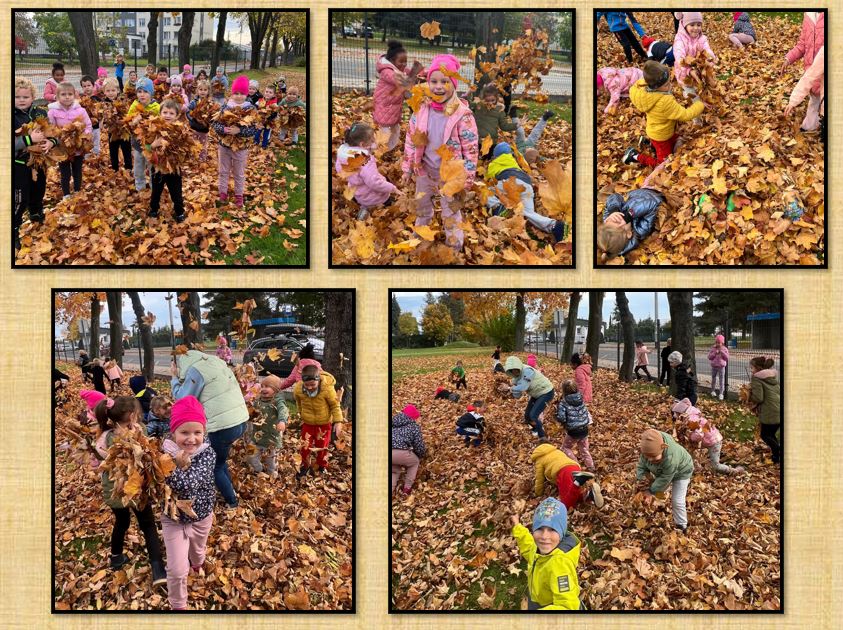 Piękna kolorowa jesień i ciepłe promyki słońca zachęcają do przebywania na świeżym powietrzu. Dlatego przedszkolaki, jak co roku, z ochotą uczestniczą w jesiennych zabawach. Spadający deszcz z liści, robienie aniołków, zabawa w ganianego, bitwa na liście czy zawody na najwyższy kopczyk z liści, dostarczyły dzieciom mnóstwo radości i uśmiechu. Z uzbieranych liści dzieci zrobiły piękne prace plastyczne. Zabawy na świeżym powietrzu mają bardzo dobry wpływ na zdrowie, rozwój i samopoczucie dzieci, dlatego korzystajmy każdego dnia z uroków pięknej Polskiej Złotej Jesieni.