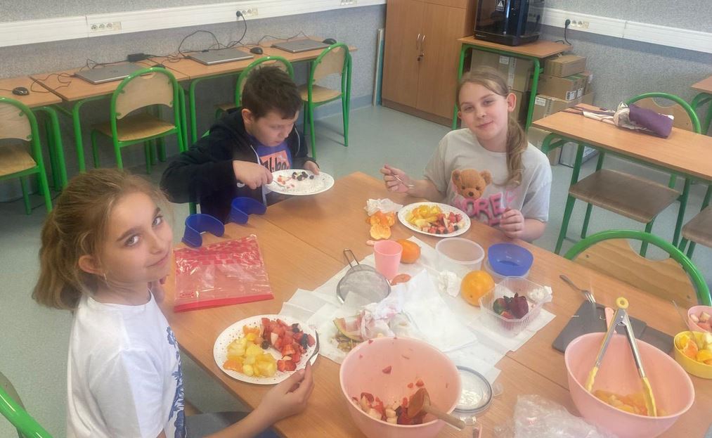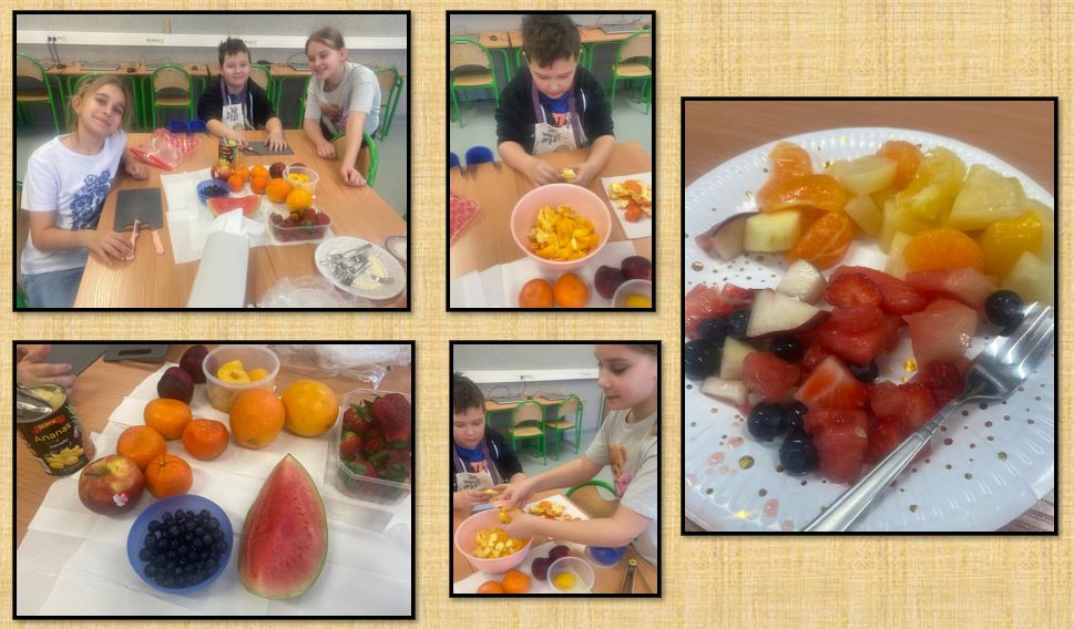 Dzisiaj na zajęciach z edukacji zdrowotnej w klasie IV uczniowie uczestniczyli w warsztatach kulinarnych, podczas których przygotowywali zdrowe drugie śniadanie w postaci sałatki owocowej. Najpierw omówiono zasady zdrowego odżywiania oraz znaczenie owoców w codziennej diecie. Następnie uczniowie samodzielnie kroili wybrane owoce i komponowali z nich kolorowe sałatki. Zajęcia rozwijały praktyczne umiejętności kulinarne, uczyły współpracy oraz zachęcały do sięgania po zdrowe przekąski.