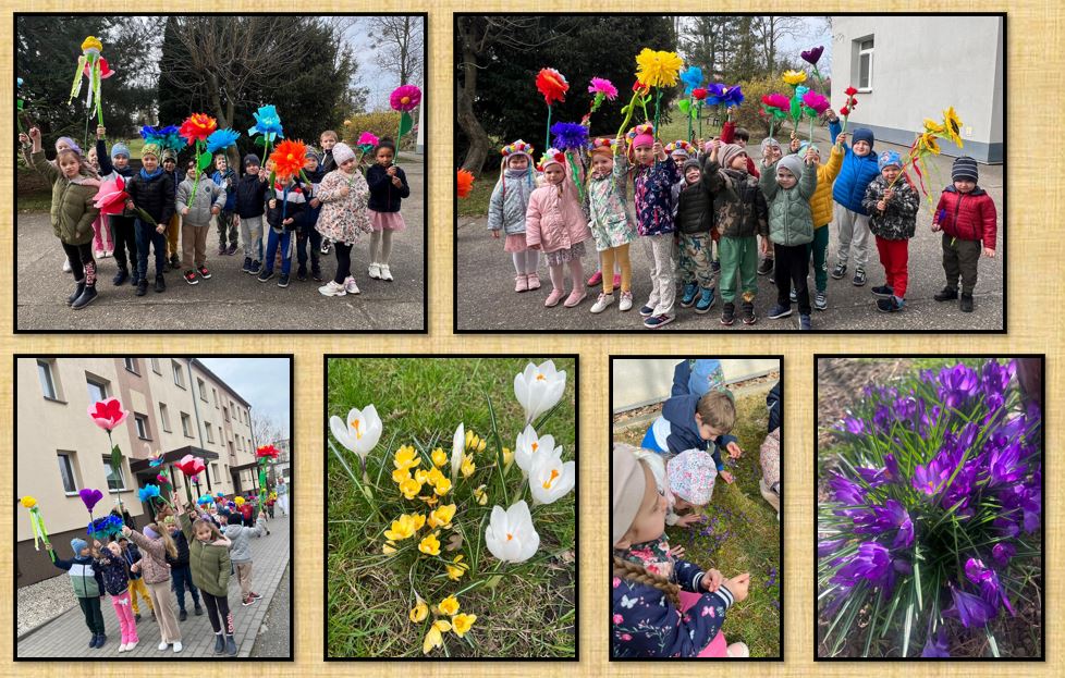 20.03.2026 r. - Pierwszy Dzień Wiosny wszystkie grupy z naszego przedszkola uczciły Wiosennym korowodem. Przedszkolaki, maszerowały ulicami powiewając barwnymi kwiatami, radośnie śpiewając piosenki o wiośnie. Kolorowy pochód zawędrował do pobliskich sklepów wzbudzając radość ich pracowników. Nie zabrakło też poszukiwania oznak przychodzącej wiosny: kwiatów, kwitnących krzewów, pąków na drzewach czy śpiewu ptaków. Zakończenie korowodu odbyło się na placu przedszkolnym, gdzie wszystkie dzieci, głośnym okrzykiem „Witaj wiosno!!!”, pożegnały Zimę a powitały Wiosnę.