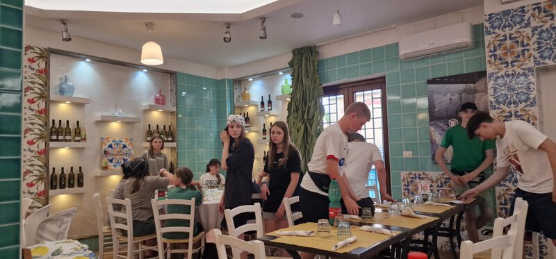 Trzeci dzień - poniedziałek - był jednocześnie pierwszym dniem naszej wizyty w szkole podstawowej, która nas gościła. Po przyjeździe zostaliśmy przywitani przez uczniów jednej z klas oraz jej wychowawców. Uczniowie z Włoch okazali się bardzo sympatyczni i otwarci. Następnie wzięliśmy udział w ciekawych zabawach integrujących. Po południu udalismy się na spacer po Pompejach